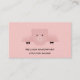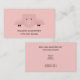 Tarjetas de visita con un dibujo de la cara de un lindo cerdo rosado. Levantado por sus pezuñas negras y mirando sobre una mesa. Dibujo tierno y caprichoso. Envuelto en un fondo rosado con corazones apagados.