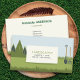 Una tarjeta de visita con textos de personalizable en un panel situado en el centro. El fondo es una imagen de un césped verde y exuberante con algunos árboles a la izquierda y un fondo azul claro en la parte superior. Hay una pala y un rastrillo a la derecha. Será apto para paisajistas y jardineros profesionales o para cualquier persona que trabaje en el campo paisajístico como diseñador de jardines, arquitecto paisajista, cuidado de siembra y césped, poda de árboles, arborisco, mantenimiento de espacios verdes, etc.