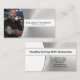El acero cepillado falso resalta el fondo de este diseño de tarjeta de presentación que presenta un marcador de posición de foto a la izquierda con el nombre y título de la plantilla a la derecha. La parte trasera incluye un diseño y colores coordinados con campos de texto para el nombre y detalles de la empresa. Reemplace la foto del marcador de posición con su fotografía en formato vertical. Rellene los campos de la plantilla, elimine el texto o haga clic en personalizar para seleccionar un estilo de fuente, tamaño y color que le guste. La foto del marcador de posición es cortesía de pexels.com.