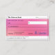 Otra elegante herramienta de Ley de Atracción de JessicaAmber - pregunta acerca de las órdenes de los personalizados! Este conjunto de tarjetas de visita contiene una réplica de un cheque en blanco, con espacio para que escriba su nombre, la fecha, el importe y más. Cada pedazo de texto es personalizable - o déjelo en blanco para escribir a mano después. También puede cambiar la imagen de fondo del diseño predeterminado de gradiente aura rosa. Pegue estos cheques por toda su casa, auto y oficina, y úsalos como recordatorios de que eres un poderoso creador que manifestará el gran dinero! Un gran regalo para tus amigos que están en las enseñanzas de Abraham-Hicks y El Secreto. ・・・ Para más suministros de la línea de contacto, visite mi tienda Zazzle.com/In_The_Vortex ・・ Para pedidos de los personalizados, envíeme un mensaje a Zazzle