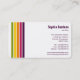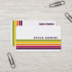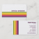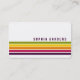 Una plantilla de tarjeta de visita con un motivo de franja horizontal de cinco colores en la parte delantera con las mismas franjas que corren verticalmente en la parte posterior y alineadas a la izquierda. Nombre en la parte delantera en letras de doble espacio. El nombre también se repite en la parte posterior con el título/puesto de trabajo y los detalles de contacto debajo. Esta plantilla de tarjeta ha sido diseñada principalmente para un individuo o independiente, por supuesto puede ser más personalizada y fácilmente puede ser adaptada para otros usos.