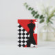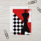 El frente tiene un diseño del tablero de ajedrez en rojo y negro. Del texto parte posterior adaptable encendido