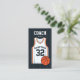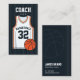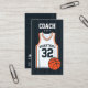Una tarjeta de visita moderna para un entrenador de baloncesto. En la parte delantera del diseño de la tarjeta de visita aparece el título COACH en grandes letras en negrita. Muestra un diseño vectorial ilustrado de una camiseta de baloncesto, incluyendo el nombre del equipo y el número de camiseta, que pueden ser personalizados. La parte posterior del diseño de la tarjeta de visita del entrenador incluye el nombre y los datos de contacto. Estilo de fuente, el tamaño de color se puede personalizar utilizando el editor completo de Zazzle.