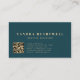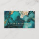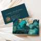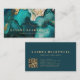Esta tarjeta de visita moderna y oscura presenta una pintura abstracta de tinta de alcohol y brillo falso en azul teal y dorado. Personalízala con tu nombre en fuente serif dorada gruesa y tu información comercial en fuente sans serif. La parte trasera de la tarjeta presenta texto dorado sobre un fondo azul teal profundo sólido, junto con un código QR que dirige a los clientes al sitio web de tu negocio.