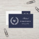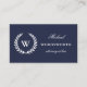 Monograma clásico de laurel blanco sobre azul oscuro, nombre de costumbre blanco y profesión en la parte delantera, información de contacto azul en la parte posterior. Se ve elegante, impresionante y caro. Adecuado para muchos profesionales (abogado utilizado como ejemplo).