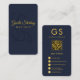 Elegante tarjeta de presentación de artista azul marino y cebada dorada con un audaz monograma, código QR moderno y disposición de personalizables. Perfecto para los estilistas de la frente, los artistas de maquillaje permanente y los profesionales de la belleza que desean una tarjeta de marca de diseño, profesional e inspirada en el lujo.