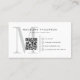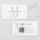 El diseño de esta tarjeta de visita presenta un estilo elegante y minimalista con un gran monograma gris en segundo plano para un toque audaz y elegante. El frontal resalta el nombre y el título en un tipo de letra limpio y moderno, mientras que el reverso incluye un código QR junto con detalles de contacto ordenados cuidadosamente con iconos simples.