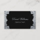 Una tarjeta de presentación elegante que tiene bordes vintage izquierdo y derecho con decoraciones plateadas falsas antiguas. El fondo es negro. En el frente, el nombre "está escrito en una elegante letra caligráfica. Todo el texto es gris plateado, como los bordes. Tiene un código QR en la parte posterior, a la izquierda.