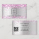 Un fondo falso plateado. Decorada con confeti rosa. Personalice y agregue el logotipo de su empresa y un texto al frente. Atrás: Plantillas para tu nombre, título, número de teléfono y tu propio código QR.