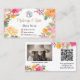 Ilustracion floral de color rosa brillante maquillaje de boho y tarjeta de visita para el cabello con flores de bonito pintadas a mano en color rosa, amarillo, flores naranjas y vegetación. con marco de terrario geométrico dorado y tipografía elegante de pincel de guión. Añade tu medio social, logotipo, código qr y una foto.