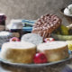 Comida de granja del siglo XIX, queso, manzanas, calabazas, mermeladas y pan de arvejas. Acuarela. Inglaterra Reino Unido.