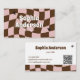 Destacar con esta elegante y divertida tarjeta de visita que presenta un patrón de tablero ondulado en tonos rosa y marrón chocolate. El diseño inspirado en la groovía de los años 70, los acentos dramáticos de las estrellas y la tipografía audaz hacen que esta carta sea perfecta para creativos, influyentes, profesionales de la belleza o cualquier persona con una marca personal audaz. Incluye un punto para que un código QR se vincule directamente a su sitio web, cartera o sociedad. Personalizar tu nombre, título y detalles de contacto para hacerlo único tuyo.