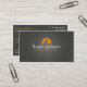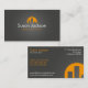 Una tarjeta de visita moderna de las propiedades inmobiliarias con un logotipo gris oscuro del fondo y del naranja que representa los bloques de apartamentos y una casa silueteada contra el sol poniente.
