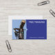 Foto de la tarjeta de visita del condensador de ajuste o del paisaje del árbol. Tarjeta de la foto de ajardinar el condensador de ajuste del árbol que reduce un árbol de pino grande. Modifique su fuente para requisitos particulares, texto y empapele todos en línea. Plantillas de la tarjeta de visita de la fotografía para la compañía del ajuste del negocio que ajardina o del árbol.