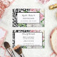 Ofrezca sus servicios como cosmetólogo autorizado con estas elegantes tarjetas de presentación de cosmetología con una moderna impresión de leopardo blanco y negro y fondo floral rosa. Personalice agregando el nombre del artista de maquillaje e información de contacto.