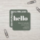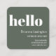 Tarjeta de negocios verde de personalizable, con tipografía y nombre HELLO, profesión, sitio web y detalles de medios sociales. En la parte trasera hay un código QR escaneado. Para generar un nuevo código QR en el diseño que enlaza a su propio sitio web, haga clic en "personalizar esta plantilla" Añadir su dirección URL o el identificador de red social en el área proporcionada y se generará un código QR sólo para usted.