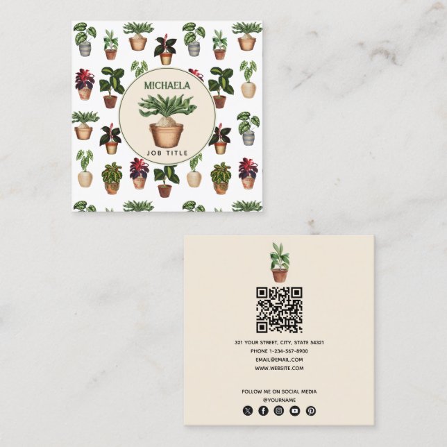 Las bonitas macetas están decoradas con diferentes tonalidades de vegetación y diferentes macetas de terracota. Un diseño moderno de acuarela de moda para todo aquel que ame las macetas, la vegetación, la jardinería, las plantas interiores, los diseños botánicos, las macetas de terracota, la naturaleza, etc. Una forma sencilla y profesional de presentar tu negocio. Iconos de medios sociales incluidos en el diseño de esta tarjeta de visita para uso personal. Personalice sus detalles para crear su propia tarjeta de visita única.