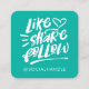 Difunde la voz y promueva su marca y presencia en los medios sociales con nuestra moderna y audaz tarjeta de presentación de medios sociales. El diseño presenta un diseño tipográfico de guión de broche blanco negrita "Like Share Follow" con un manejo personalizado de los medios sociales en un fondo verde acuático de moda. Personalice el reverso de la tarjeta con su nombre, información de contacto y nombre de usuario de redes sociales. Diseño original por Moodthology.