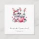Business cards with an illustration featuring 2 white furry bunnies sharing a big pink heart. The girl bunny is wearing a cute bow on her head and heart-shaped glasses. The boy bunny is wearing an adorable little suit with a tie.