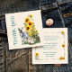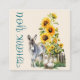 Little square thank you message insert cards. Sunflowers, donkey and ducks design for a farm or homestead business. Big "thank you" text is vertical on the front of pale beige cards. A gray donkey and two white ducks stand in front of a gray picket fence and tall yellow sunflowers. On the back, customize the paragraph in blue printed font bordered by a sunflower frame. Include a thank you message to customers, company name, address, and contact information along with online locations, such as a website and / or social media.