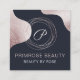 Una elegante y elegante tarjeta de visita perfecta para una amplia selección de negocios como belleza, moda, maquillaje, peluquería, spa y mucho más. El diseño presenta un elegante diseño abstracto de textura de oro rosa con diseño de líneas abstractas. Personalice con su monograma de empresa, nombre y datos de contacto.