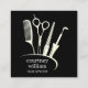 Herramientas Profesionales Icono Diseño Hair Stylist Tarjeta de Negocios. Muestra tu experiencia con esta tarjeta de visita personalizado cuadrada con estilo de cabello que presenta un diseño elegante de herramientas profesionales de salón: tijeras, peine, hierro curling y más. Perfecto para los estilistas que desean una forma limpia y moderna de presentar sus datos de contacto, esta tarjeta incluye espacio para su nombre, título e información de salón en la parte posterior. El minimalista negro con el diseño de texto en blanco ofrece un estilo elegante y pulido, ideal para el trabajo en red, las referencias de clientes o dejar atrás su estación de salón.