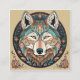 Este es un ilustracion hecho a mano de un lobo lindo. El fondo es un degradado de azul, y el lobo es un marrón claro. Tiene ojos grandes y una nariz pequeña. Sus oídos están colgados, y tiene un poco de piel en la cabeza. El lobo está parado en una colina, y hay árboles y arbustos cerca. Es una imagen simple pero impactante.