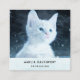 Tarjetas de presentación con una adorable fotografía de un gatito blanco de pelo corto con ojos azules brillantes. Mirando a lo lejos.