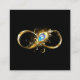 Oro, símbolo brillante de infinito, decorado con una pluma de pavo real de joyas con un fondo turquesa en negro.