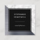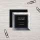 Modern, trendy design features simple white lettering in a black square, against a dramatic background of white marble and silver faux brushed metal foil. Add your contact information on the reverse in white sans serif font on a solid black background.