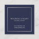 Elegante diseño elegante con monograma, nombre y detalles en estilo de fuente profesional plateado con borde cuadrado plateado sobre fondo azul marino. Perfecto para un diseñador, estilista, consultor, inmobiliario y muchas otras profesiones. Nota: Los detalles del Relieve metalizado se simularán en la obra de arte. Este producto no contará con ningún relieve ni capa que creen un efecto metalizado.