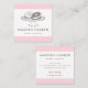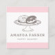 Tarjetas de visita de panadería/panadería con un caprichoso ilustracion de dos donuts en una bandeja de servicio y bordes rosas arriba y abajo. Hay campos de plantilla para tu nombre, título/nombre comercial, información de contacto y medios sociales en la parte posterior. Las fuentes y los colores se pueden cambiar con la herramienta de diseño