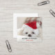Una tarjeta de visita con una adorable foto de un lindo perrito blanco con un gorra de navidades rojos.