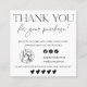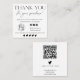 A clean black and white thank you card designed for modern small businesses and creatives who want a polished, professional look. The front features a simple appreciation message with space for a logo, social icons, and a review reminder, while the back highlights a bold QR code for quick links. Ideal for boutique packaging, handmade orders, beauty brands, and online shops. Easy to customize with your own logo, code, and contact details for a cohesive brand experience. Works beautifully for minimalist, elegant, or monochrome packaging styles.