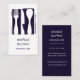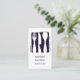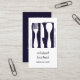 Promueva sus servicios de restaurante, panadería, catering o chef personal con estas elegantes tarjetas de visita en azul marino y blanco. Con una silueta de un cuchillo, un tenedor y una cuchara en blanco sobre un cuadrado azul oscuro angustiado, con dos líneas de texto personalizado bajo letras clásicas. Añade tu detalle y contacto al reverso en blanco sobre un fondo azul contrastante.