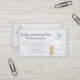 Esta encantadora tarjeta de visita incluye un bonito ilustracion de elefantes de color acuático. A la derecha se ve un pequeño elefante de bebé que sostiene un globo en forma de corazón azul. Delante de él se coloca una pila de bloques de alfabeto de madera. A la izquierda se imprime una muestra del nombre de guardería o de guardería, seguida de los datos de la empresa. Es perfecto para una guardería, un negocio de niñera, niñera u otro proveedor de servicios de cuidado infantil.