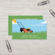 Una tarjeta de visita con un ilustracion de paisaje con césped, sol, nubes y una cortadora de césped. Podría ser adecuado para servicios de cuidado de césped y jardinería profesional o para personas que trabajan en el campo paisajístico como paisajismo, siembra y mantenimiento del césped, mantenimiento de espacios verdes, etc.