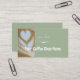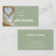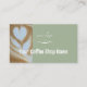 Add your custom text, business logo, and photograph to this business card template. All of the modern stylish script is editable. On the front is a photo of coffee latte art in a heart shape. If you prefer you can replace this photo with your own photograph. Add your business logo to the front of the card. This trendy sage or eucalyptus green and white card would be great for a coffee shop. Add the name of your cafe or coffee house. On the back you can add custom text and your address, hours, and more.