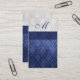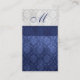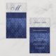 Una elegante tarjeta de visita con un monograma para un spa, estilista o consultor, con un rico patrón de damasco floral azul combinado con acentos plateados.