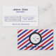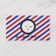 Tarjeta de visita de la peluquería de caballeros con el bigote, las tijeras, y el logotipo de la insignia del peine. Detrás de la tarjeta tiene fondo rayado peluquero tradicional y el logotipo es completamente reemplazable con uno de su opción. La tarjeta y los gráficos son completamente adaptables. Perfeccione para un peluquero, una barbería, o un estilista.