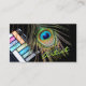 Diseño de la tarjeta de visita del artista de maquillaje con la pluma del pavo real y la paleta colorida de la sombra de ojos en fondo negro. Esta tarjeta elegante del perfil es perfecta para los chicas de moda, los beauticians, los cosmetologists, los salones de belleza del pelo y del maquillaje y otras profesiones similares. Si usted necesita alguna ayuda con este diseño, no dude en entrarme en contacto con.