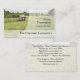 Una plantilla de la tarjeta de visita con una foto de un cortador rojo del tractor y del heno del vintage, cortando la hierba en un campo en un paisaje rural de la granja. La tarjeta tiene una capa semitransparente curvada para el texto en el frente, y una versión más pálida de la imagen en el revés para los detalles de la dirección y la otra información. La tarjeta se pone para cultivar o cosechar contratistas, pero se podría utilizar para cualquier negocio agrícola.