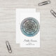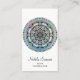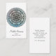Un hermoso patrón de flores geométricas de mandala simétrico en una tarjeta de visita del instructor de yoga con fondo de chispa azul, personalizado con tu nombre en un tipo de letra de escritura a la moda. Personaliza tu práctica de yoga. También puede desear personalizar para una práctica de meditación.