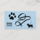 Una tarjeta de visita azul con el ilustracion de una pata, una correa y una silueta de un perro para actividades de caminante de perros u otros servicios mascotas como el groomer, el comportamiento animal, etc. Es totalmente personalizable y la esperanza te ayudará en tu negocio.