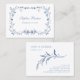 Estas hermosas y polvorientas tarjetas de visita azules y blancas presentan un marco floral floral de color azul vintage con bonitas hojas botánicas y flores, y caligrafía elegante junto con texto clásico. El marco rodea la información de contacto sobre un fondo blanco sencillo. Estas tarjetas son especialmente perfectas para los coordinadores de bodas o consultores de novias, comerciantes de antigüedades o vendimias, y amantes de todo lo que sea gentil y romántico.