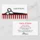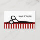 Separe la palabra sobre su nuevos salón de pelo y salón de belleza elegantes con estas tarjetas de visita rayadas rojas y negras elegantes y de moda de moda con un par de esquileos del corte del pelo negro embellecidos con un rizo del pelo. Personalice estas tarjetas modernas del salón de belleza añadiendo el nombre del estilista.