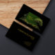 Make a uniquely sophisticated statement with this elegant botanical business card. The design features a dramatic, solid black background, creating a striking high-contrast canvas. Along the bottom edge, a miniature, realistic landscape unfolds, featuring lush green undergrowth with detailed ferns and tiny pops of yellow and red wildflowers. A beautifully rendered, leafy green tree stands prominently on the right, balanced by a smaller bush on the left. This exquisite natural scene provides a sophisticated foundation for the central element: a clean, dark green square panel, perfectly centered and enclosed by a minimalist, thin gold border, offering a refined space for your professional details. A tiny butterfly adds a subtle whimsical touch. These business cards are ideal for professionals connected to nature, design, or conservation, such as landscape architects, environmental consultants, nature photographers, boutique nurseries or garden centers, park conservancy groups, or eco-friendly brands. This versatile design can also be adapted for elegant event place cards, unique contact cards for artists, or sophisticated product tags.