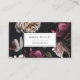 El elegante diseño de una tarjeta de visita floral incluye rosas de marfil, peonías rosadas de color negro y flores burdeos profundas sobre un fondo negro oscuro y dramático y suave. Añada su nombre o nombre de negocio con letras modernas, colocadas sobre un elemento blanco en el centro. Personalice el lado inverso con su información de contacto, junto con un código QR de personalizable.
