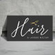 Elegante plantilla de tarjeta de visita de personalizable con icono FAUX de tijeras de oro /fondo gris y texto de escritura a mano. Diseño moderno y limpio, perfecto para peluquería y peluquería.