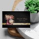 Elegante mezclador de pasteles florales y rayas doradas sobre fondo negro.